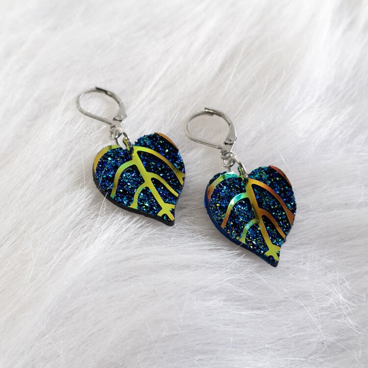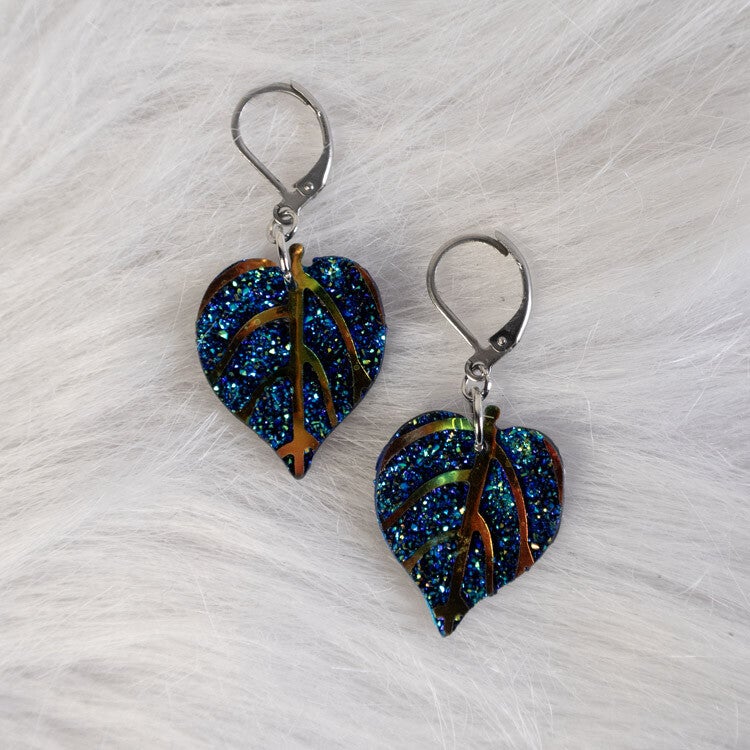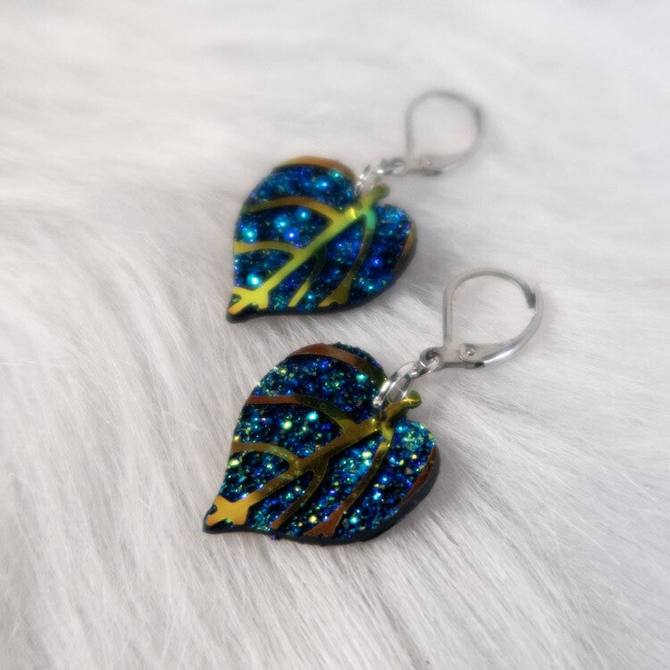 A bold, nature-inspired design featuring shimmering leaf shapes with detailed vein accents. The glitter finish gives each piece a vibrant, eye-catching look, while the clean silhouette keeps it easy to style. Lightweight and full of character, these earrings add a magical touch to any outfit.