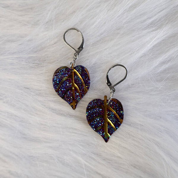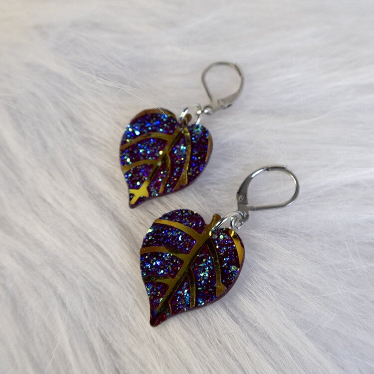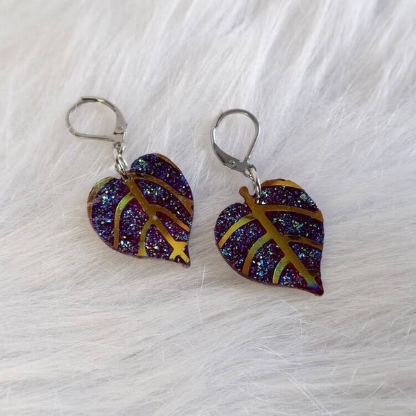 A bold, nature-inspired design featuring shimmering leaf shapes with detailed vein accents. The glitter finish gives each piece a vibrant, eye-catching look, while the clean silhouette keeps it easy to style. Lightweight and full of character, these earrings add a magical touch to any outfit.