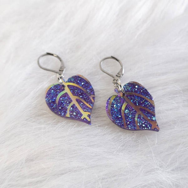 A bold, nature-inspired design featuring shimmering leaf shapes with detailed vein accents. The glitter finish gives each piece a vibrant, eye-catching look, while the clean silhouette keeps it easy to style. Lightweight and full of character, these earrings add a magical touch to any outfit.