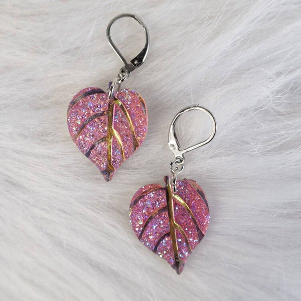 A bold, nature-inspired design featuring shimmering leaf shapes with detailed vein accents. The glitter finish gives each piece a vibrant, eye-catching look, while the clean silhouette keeps it easy to style. Lightweight and full of character, these earrings add a magical touch to any outfit.
